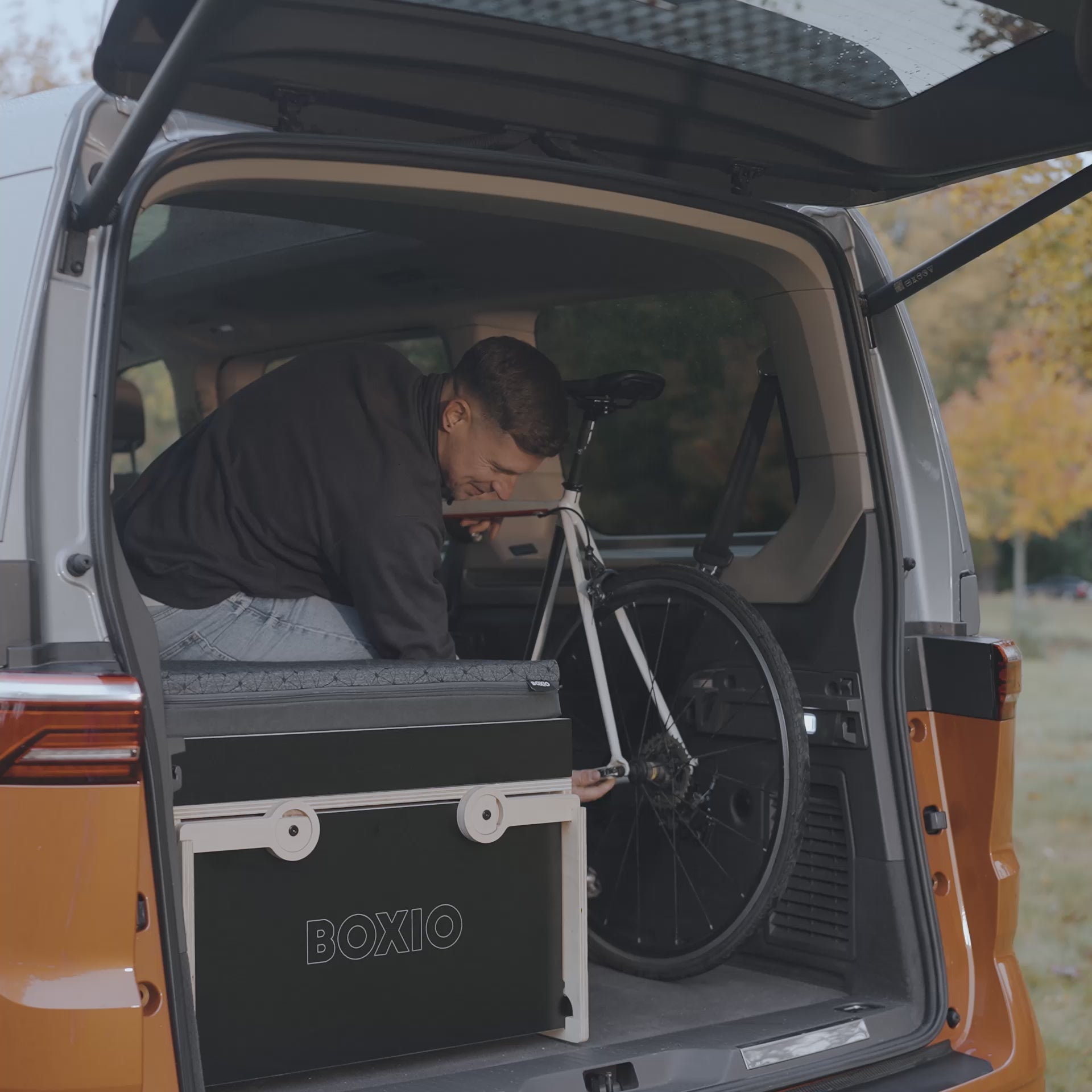 Reist du mit einem Kombi? Dann ist das BOXIO BED mit seinen höhenverstellbaren Füßen dein idealer Begleiter. Nach dem Einsatz lässt es sich kompakt zusammenklappen – so bleibt dein Fahrzeug tagsüber voll nutzbar.